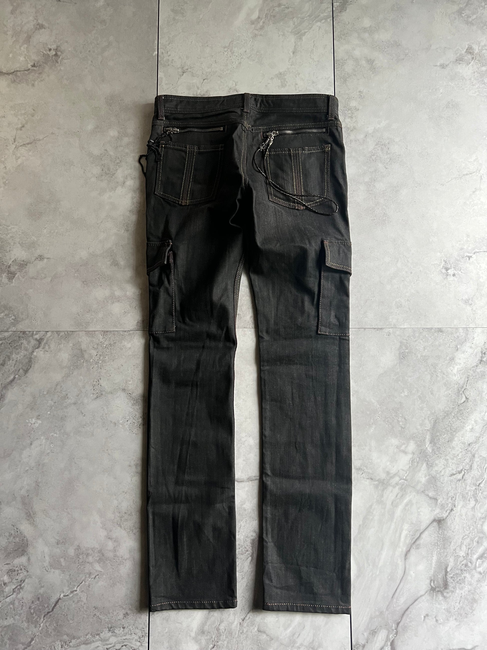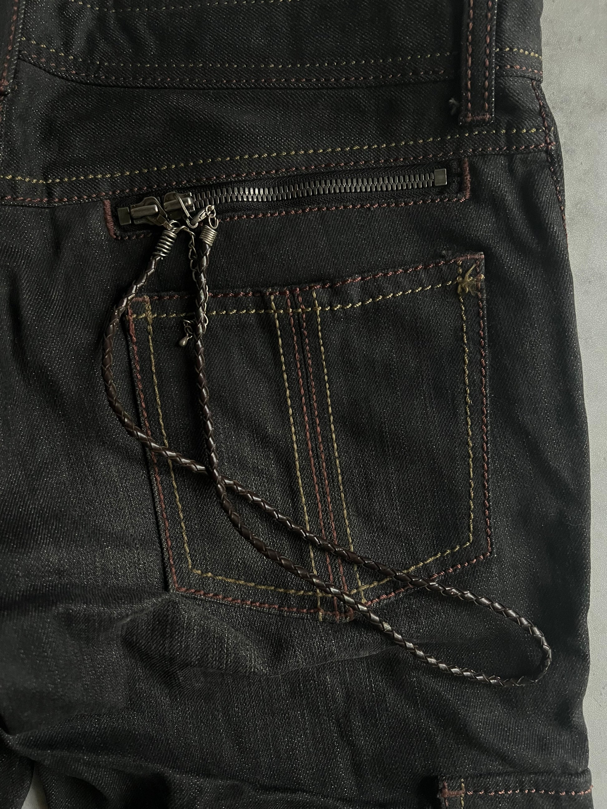 For sale today are a unique pair of cargo pants that come with chains and braided leather tassels attached to the back zipper pockets.
